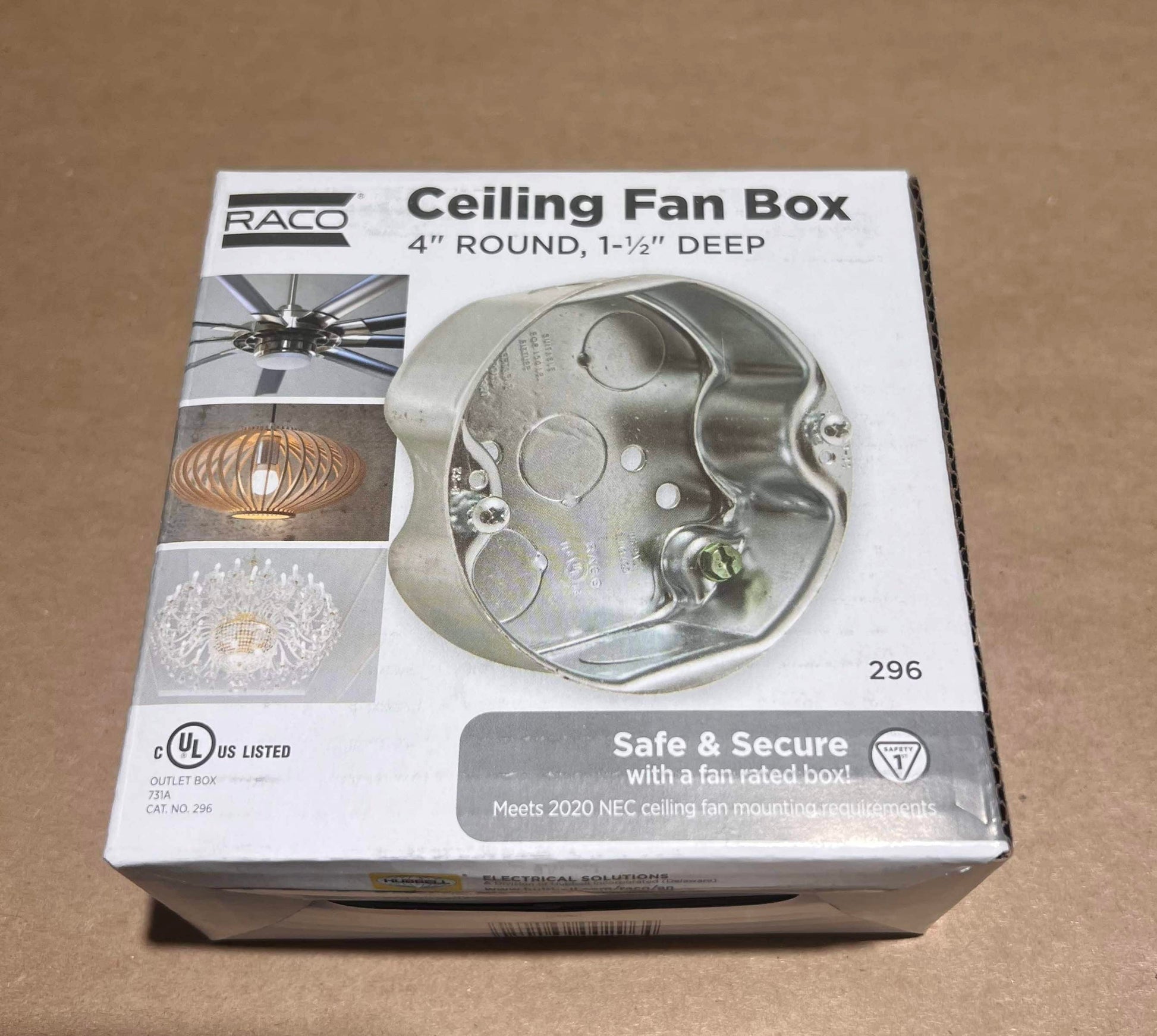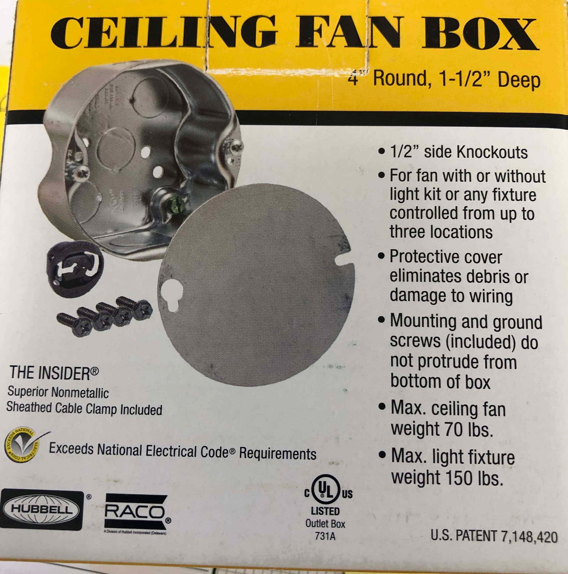Constructed of pre-galvanized steel. No protruding ground screw or fan mounting screws allows easy installation. Steel cover protects wires from damage, paint, and drywall compound during installation. Maximum support load for ceiling fans 70 lbs. and 150 lbs. for static light fixtures. #10-32, 1 in. long ceiling fan screws provided and provision for #8-32 fixture mounting screw. Easy to follow instructions and mounting hardware included. Supplied with five 1/2 in. knockouts; 1/2 in. side knockouts Width: 4 inches -- Depth: 1-1/2 inches --Height: 4 inches Conduit Size: 1/2 inch -- Capacity: 15.8 cu in |